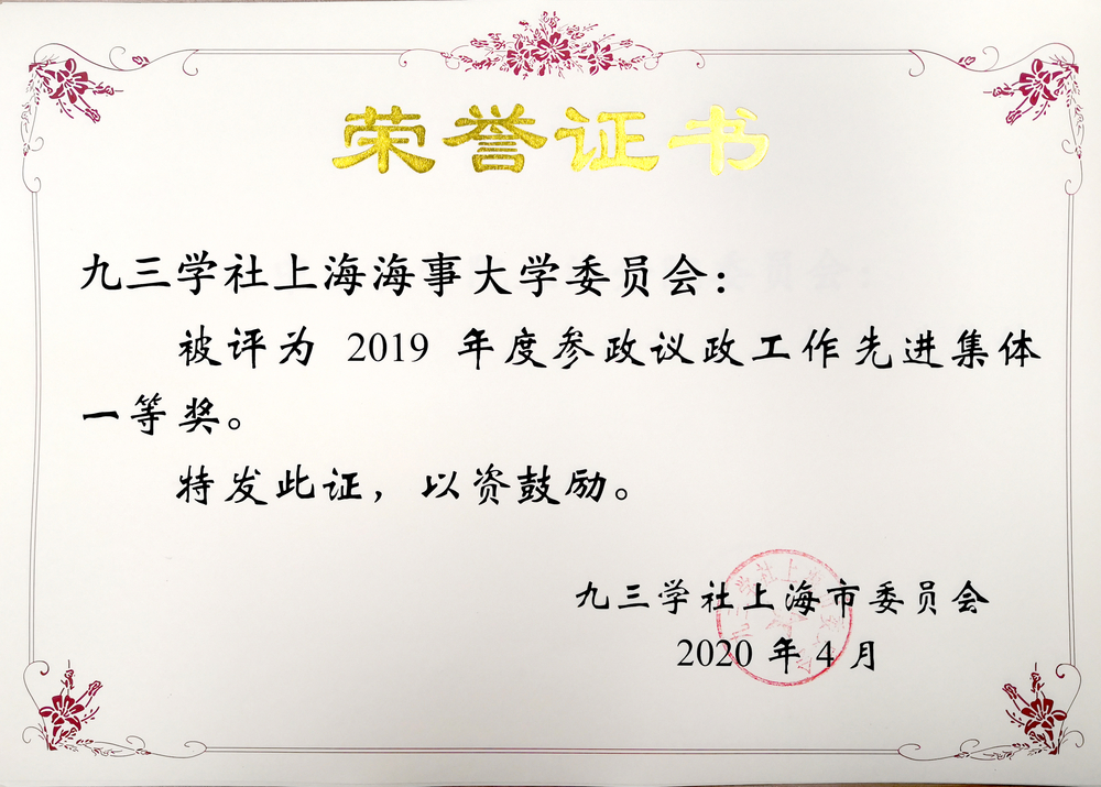 4月17日,九三学社上海市委召开2020年度参政议政工作暨表彰会,会上表彰了2019年度参政议政工作先进集体和先进个人,九三学社上海海事大学委员会获得参政议政工作先进集体一等奖、信息工作先进集体一等奖;由九三学社上海海事大学委员会执笔完成的“关于大力发展临港新片区离岸贸易服务产业的建议”获优秀调研成果二等奖,该成果已转化为九三学社上海市委提交市政协的集体提案。此外,林江等共5位社员获评2019年度信息工作先进个人,社员方敏获评优秀信息联络员。