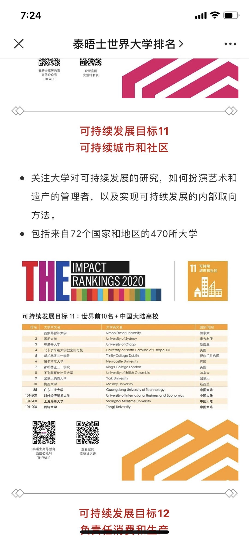 可持续发展目标11(可持续城市和社区),关注大学对可持续发展的研究,如何扮演艺术和遗产的管理者,以及实现可持续发展的内部取向方法,包括来自72个国家和地区的470所大学参与排名。可持续发展目标16(和平、正义与强大机构),评估大学在法律和国际关系方面的研究,如何扮演政府顾问的角色,以他们的学术自由政策,包括来自75个国家和地区的453所大学参与排名。