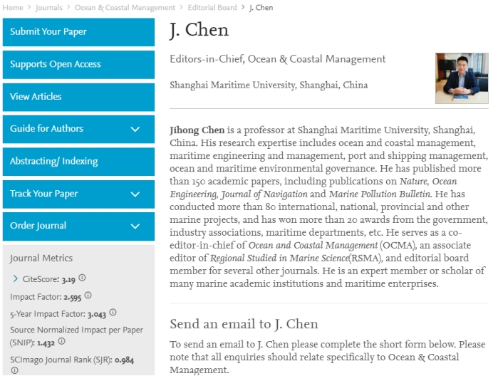 OCMA期刊是爱思唯尔旗下国际海洋领域的老牌知名期刊,JCR Q1区SCI期刊,2018年影响因子为2.595,近5年平均影响因子为3.043,最新CiteScore评分3.19。陈继红教授将重点负责该期刊国际海洋海事规划与管理等领域论文;Bruce Glavovic和Tim Smith教授将重点负责该期刊国际海洋海岸生态与环境等领域论文。