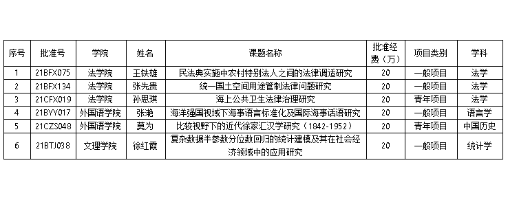 日前, 全国哲学社会科学工作办公室公布了2021年度国家社科基金项目立项结果,上海海事大学6项课题获得资助,立项率为24%,高于全国平均立项率(14.2%),具体立项情况如下: 撰稿:郑爱兵 来源:科技处 责任编辑:姚旭