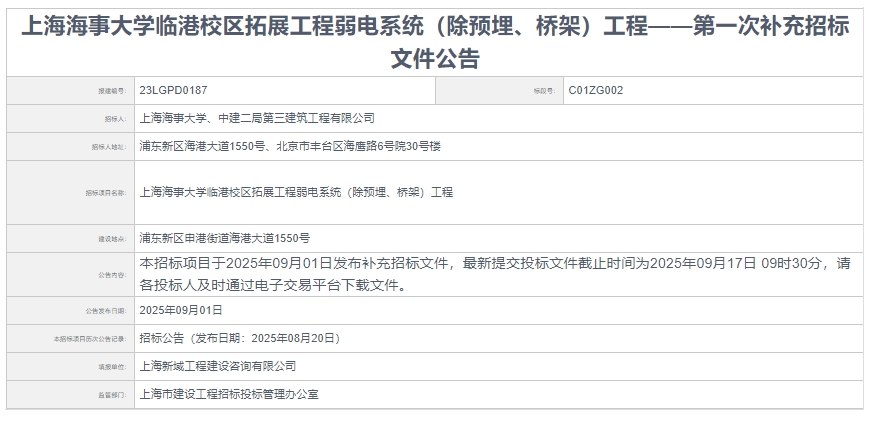 [更正公告]上海海事大学临港校区拓展工程弱电系统(除预埋、桥架)工程 GCWC2025023