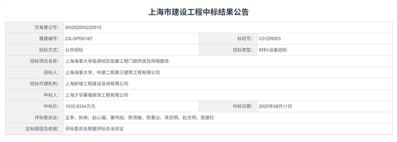 [中标结果公示]上海海事大学临港校区拓展工程门窗供货及伴随服务GCWC2025015