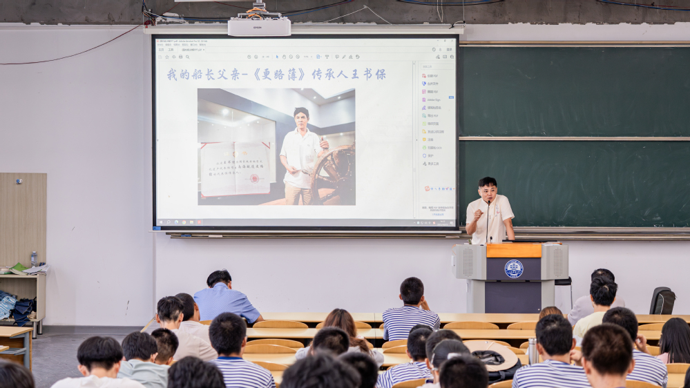 王振忠以一曲《潭门渔港》拉开讲座帷幕,用家族四代人的航海记忆,向师生娓娓道来这本被誉为“南海天书”的古老秘籍背后的传奇故事。《更路簿》是潭门渔民世代相传的航海秘籍,它不仅是南海航行的实用指南,更是一部承载着历史记忆、文化基因和精神信仰的“活态史诗”,是我国发现和开发南海诸岛的真实记录,也为现代海洋治理、技术创新和文化自信提供独特智慧。