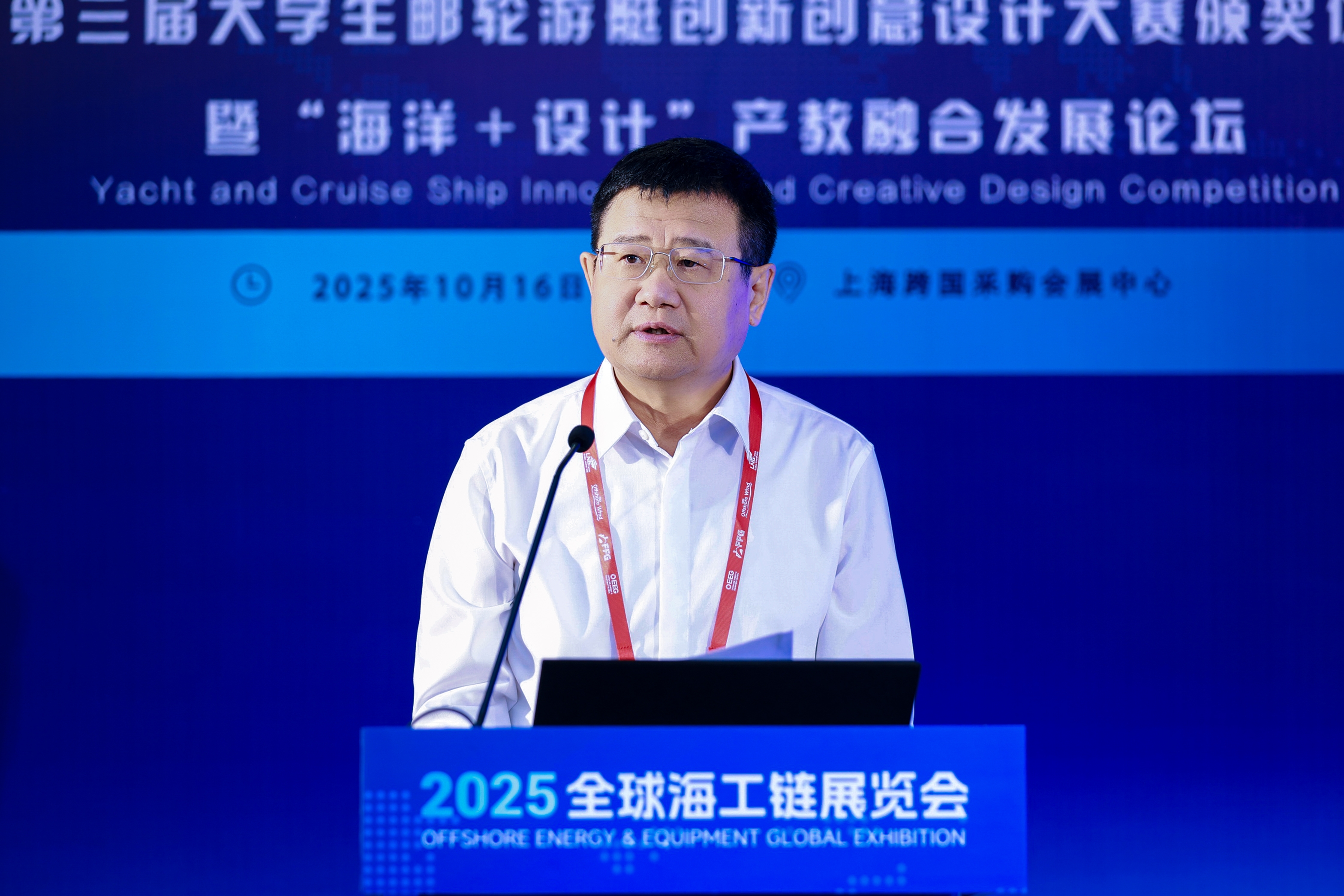 10月16日,2025大学生邮轮游艇创新创意设计大赛颁奖仪式暨“海洋+设计”产教融合发展论坛在上海跨国采购会展中心举行,活动作为2025全球海工链展览会(简称OEEG海工展)的分会场精彩亮相。校党委书记宋宝儒出席并致辞,200多名校内外师生参加了此次活动。