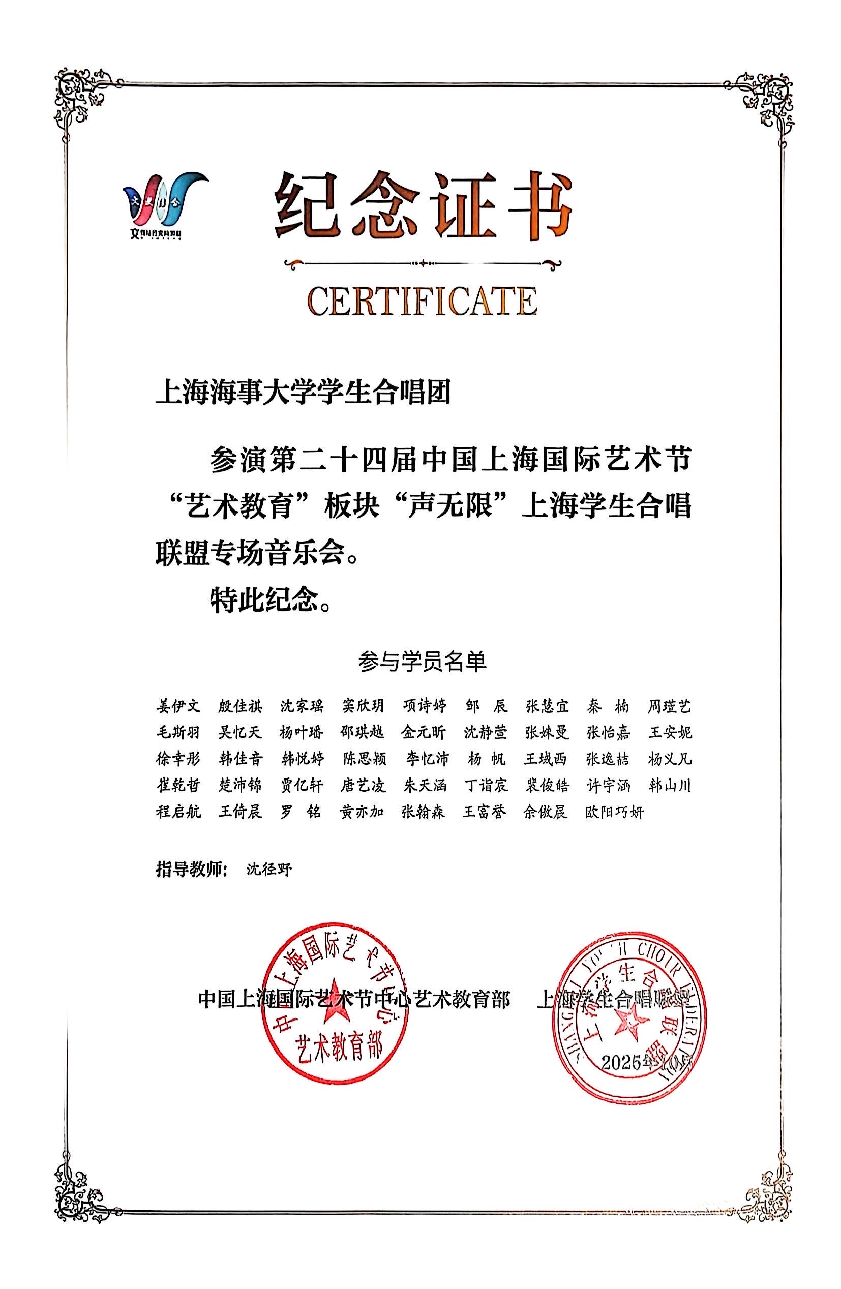 10月14日,由文化和旅游部主办、上海市人民政府承办的第二十四届中国上海国际艺术节“艺术教育”板块“声无限”上海合唱联盟专场音乐会,在上海城市草坪音乐广场举行。学校合唱团作为上海学生合唱联盟成员,精心筹备,组织排练和展演,在高水平的艺术盛会中,唱响“海事青年”的青春乐章。