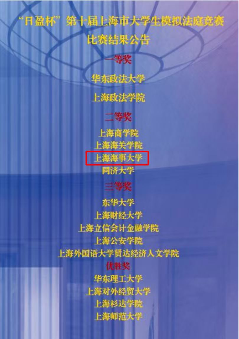 近日,由上海市教育委员会指导、上海市法学会主办的"日盈杯"第十届上海市大学生模拟法庭比赛落幕。上海海事大学代表队凭借扎实的法律素养、出色的庭审表现和默契的团队协作,从全市15所高校代表队中脱颖而出,荣获二等奖,充分展现了海大学子在法学实践领域的风采。