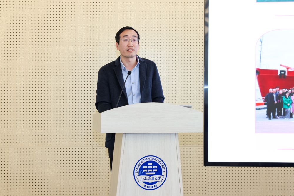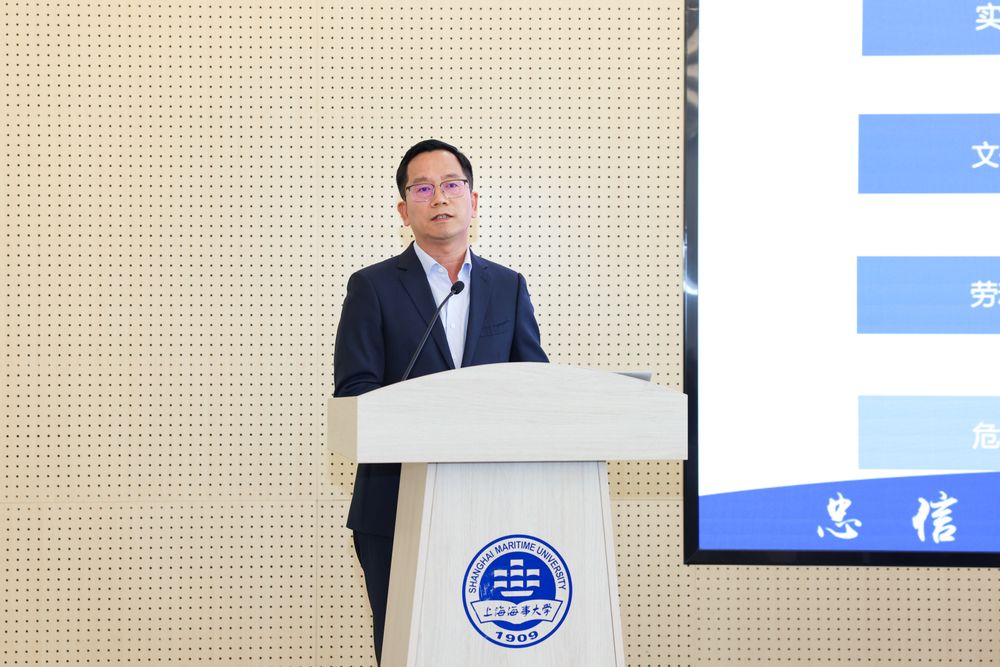 图9 商船学院党委书记秦立卿以“深化立德树人综合改革,打造新时代‘航海家的摇篮’”为题作交流发言
